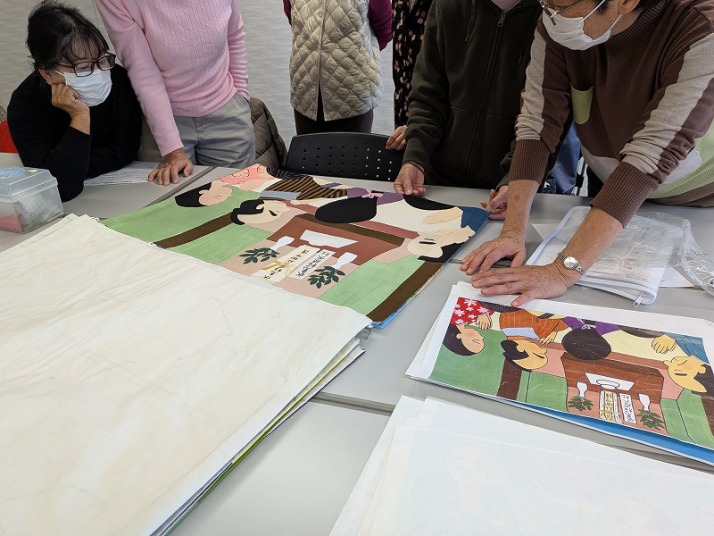 大型作品は部会で細部を調整し、持ち帰って丁寧に縫い上げます。
